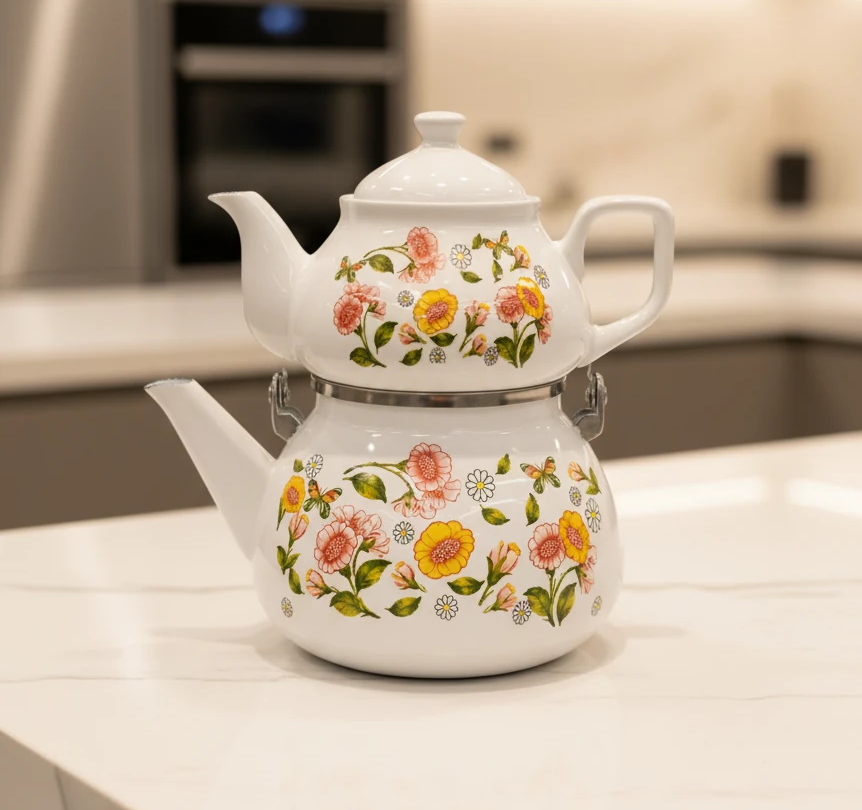 کتری قوری لعابی دسته فلزی طرح گل رسا کد 101